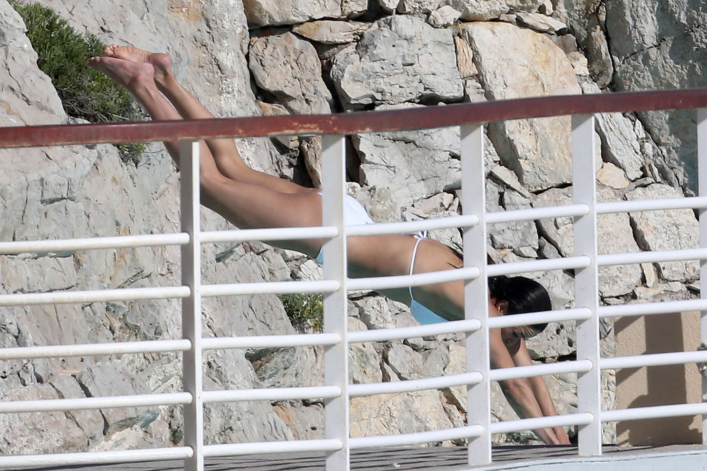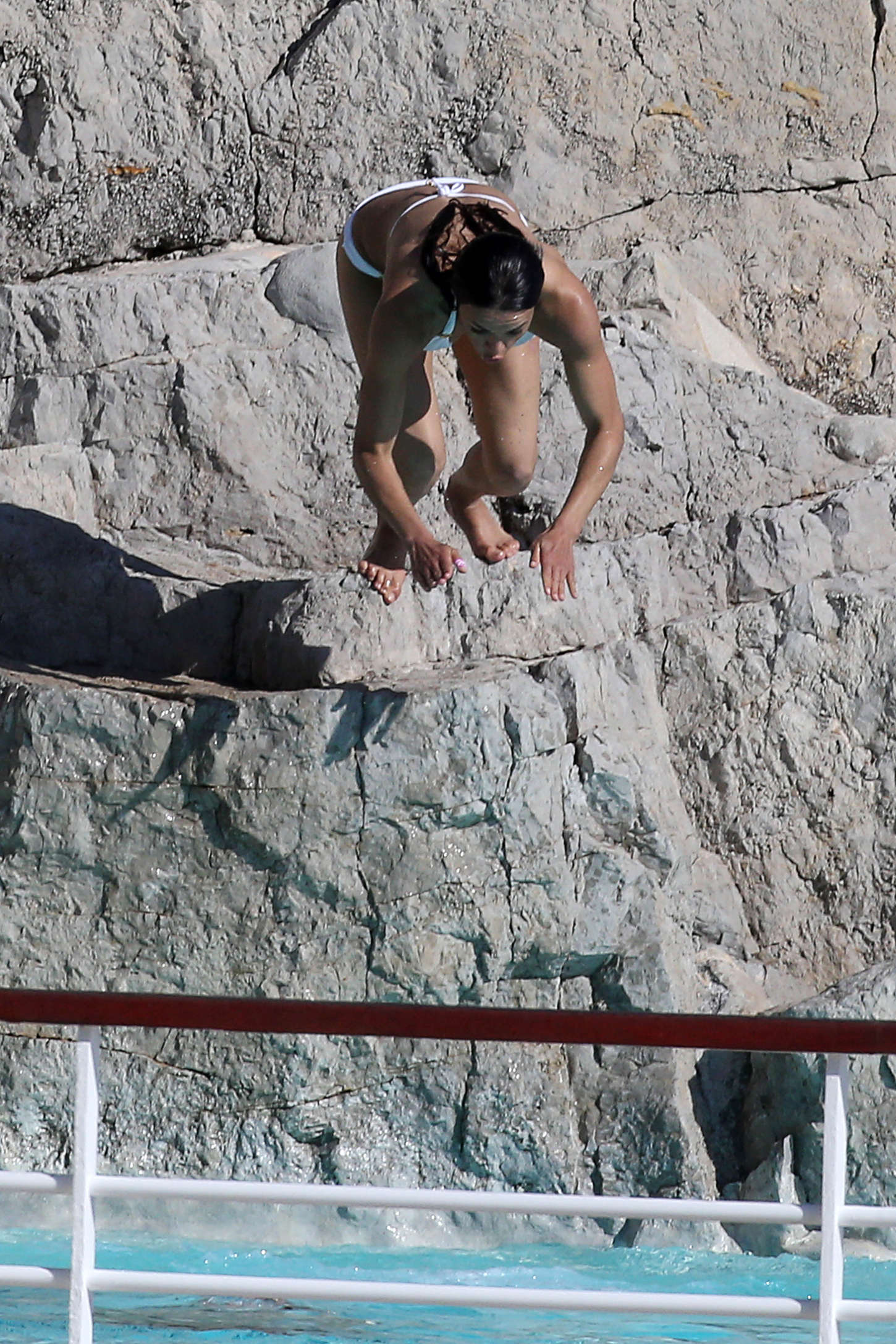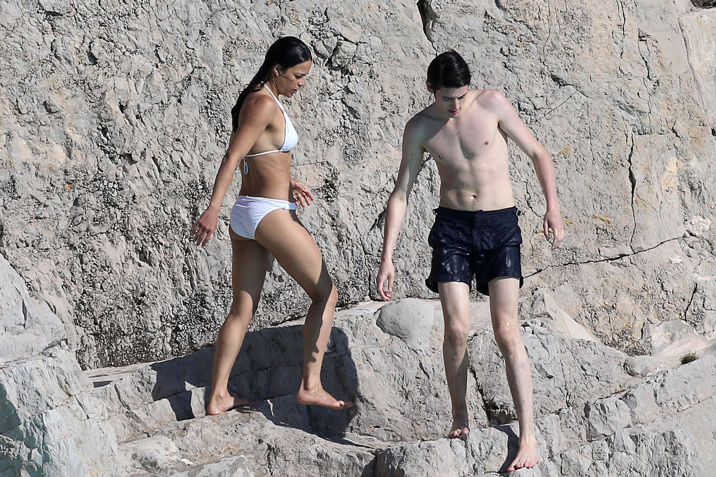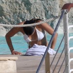 Michelle Rodriguez alterne à Cannes robes de soirées et bikinis… On vous présente ici la seconde proposition. A la piscine avec quelques amis, l’athlétique actrice de Fast and Furious ou de Lost a choisi un bikini blanc de la marque Vix.