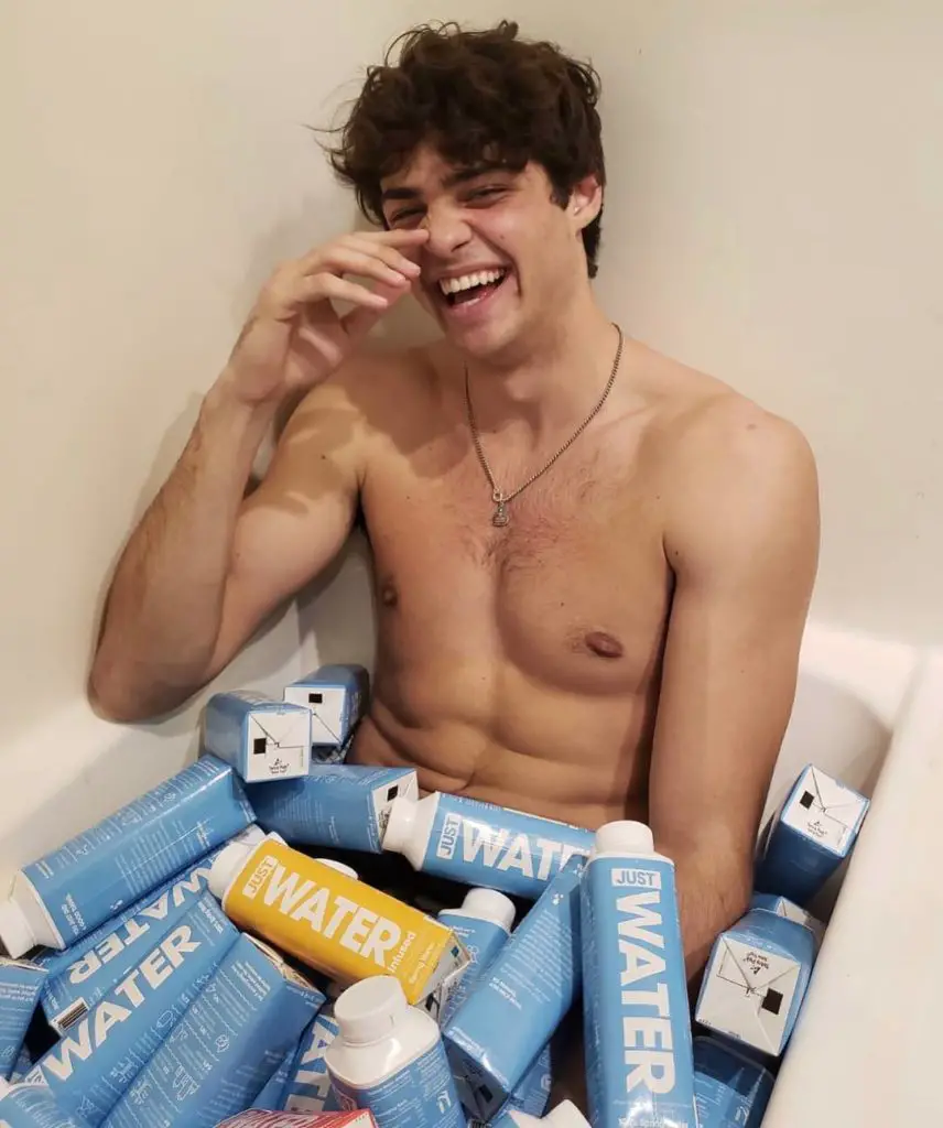 Noah Centineo, dans une baignore, inondée de bouteille d’eau (en carton) de la marque Just water. Publication sur son compte instagram.