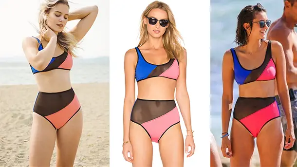 Les belles Tiera Skovbye (Polly dans Riverdale) et Nina Dobrev (The Vampire diaries) ont toutes deux été vues dans le bikini EOS de la marque Kore Swim. Le maillot monte, certes, très haut au dessus du nombril, mais est en maille filet transparente. On retrouve cette maille dans le soutien également.