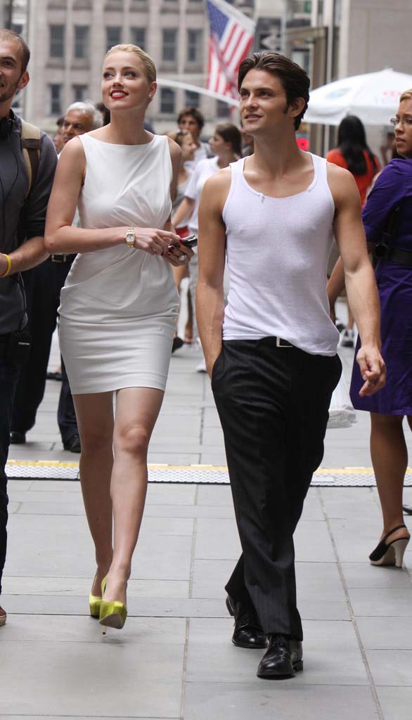 Cette semaine, on pouvait surprendre Shiloh Fernandez entre deux prises, sur le tournage de Syrup à New York city. Le film raconte l’ascension de deux vingtenaires dans l’industrie du soda. Au casting, on retrouve également Amber Heard et Kellan Lutz. Sur les photos, ci-dessous, retrouvez Shiloh avec un débardeur blanc quelque peu usé et un pantalon de costume à rayures…Mais admirez aussi les jolies formes d’Amber.