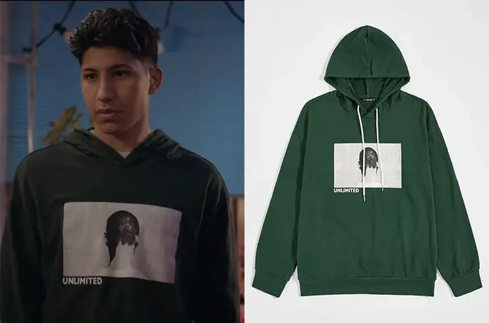 Redouane (Abdallah Charki) porte un sweat vert à capuche dans Skam France 9×01. On y voit la photo d’une tête vue de l’arrière et la mention UNLIMITED. On le trouve ici