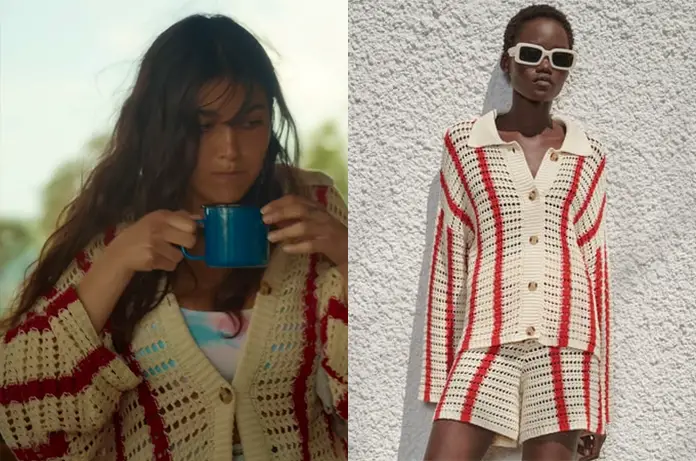 Devon (Devon Smith) porte ce joli cardigan à rayures rouges dans Snowflake Mountain 1×05. Il s’agit d’un ancien modèle Zara.