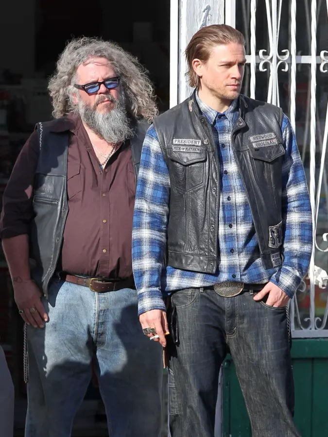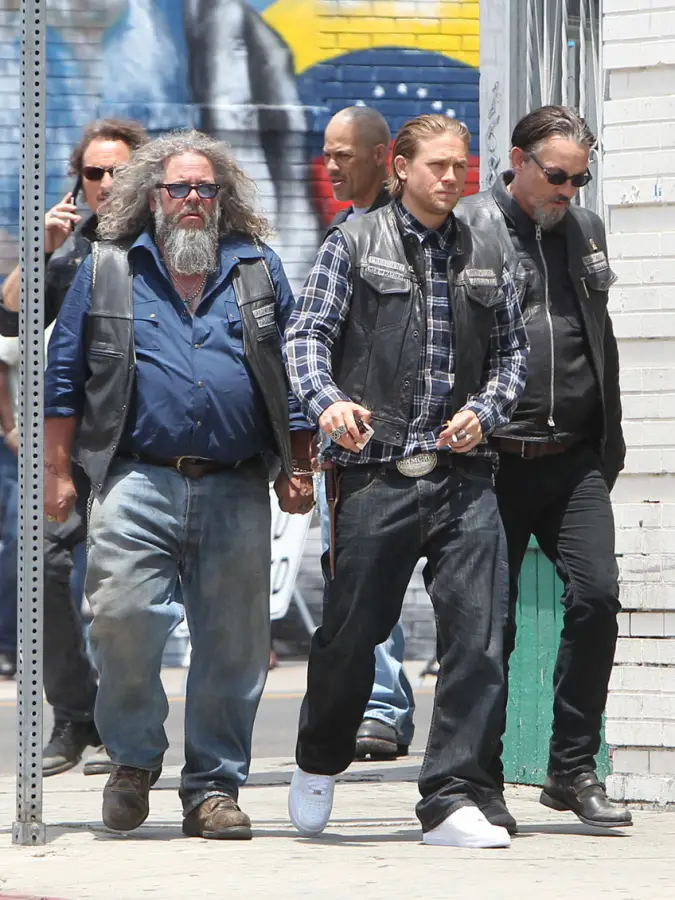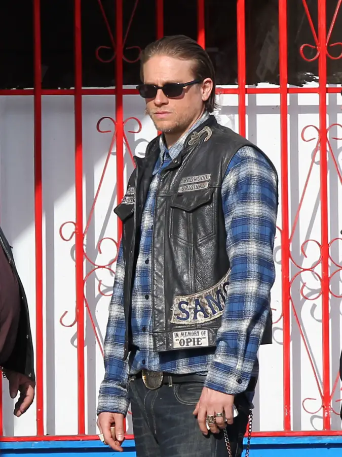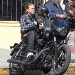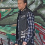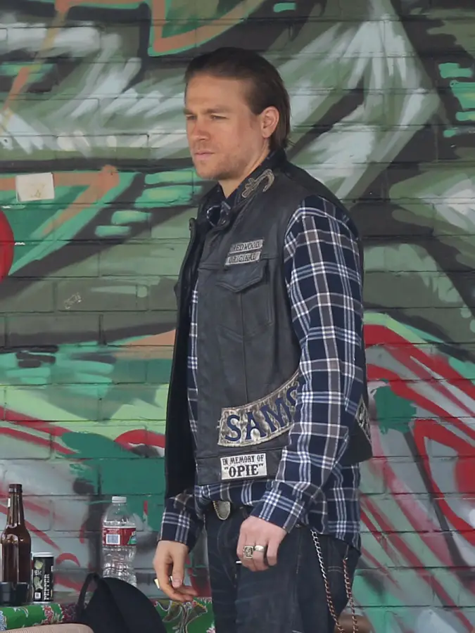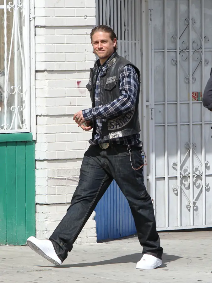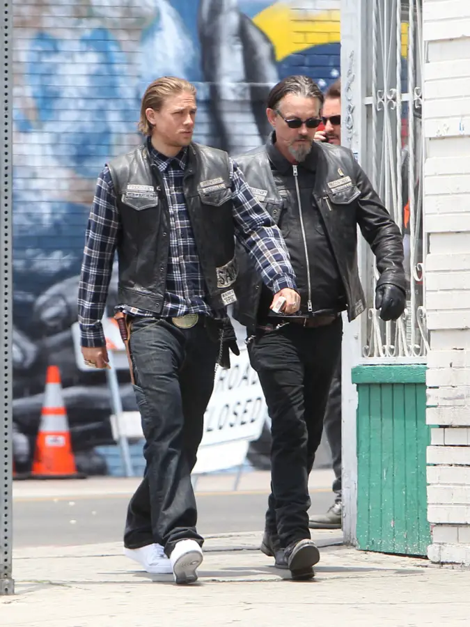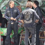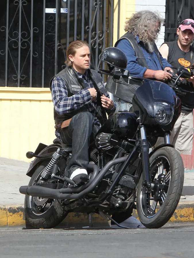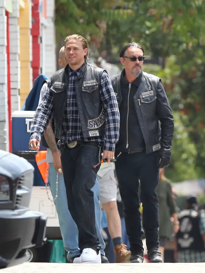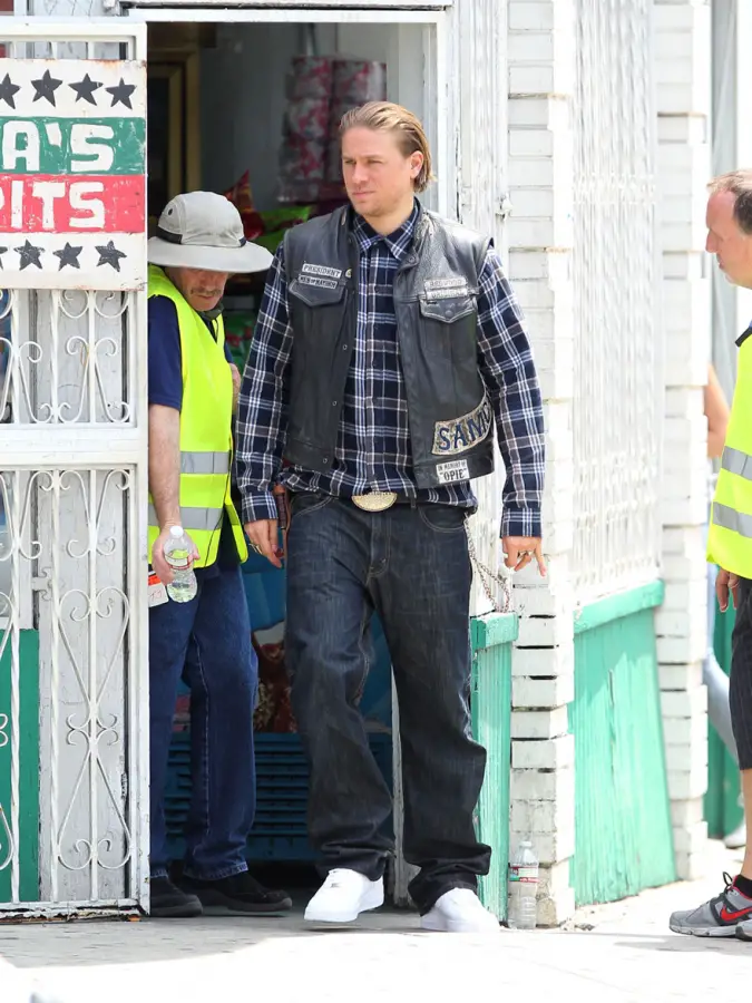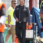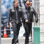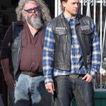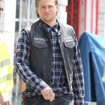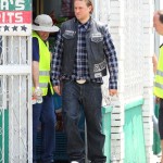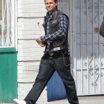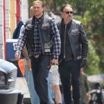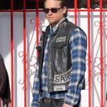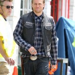 Et voilà, l’acteur Charlie Hunnam a retrouvé sa tenue de Jax Teller : chemise à carreaux, veste de cuir sans manches, jeans…et petite barbe. C’était le 29 mai sur le tournage de la saison 7 de Sons of Anarchy, à Los Angeles. Faudra-t-il attendre la sortie de Crimson peak, de Guillermo del Toro pour revoir le comédien en costard, comme le montre la photo de tournage ci-dessous ?