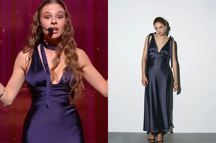 Anouk a revêtu une longue robe bleu marine sur le plateau de la Star Academy ce 28 décembre. Les rubans des bretelles ont été découpés et réutilisés en foulard.