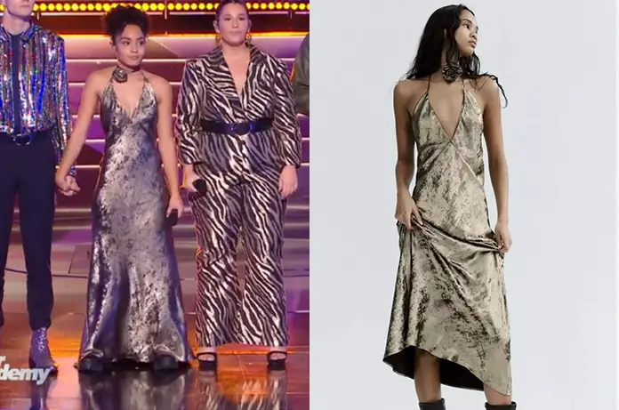 Candice portait une longue robe métallisée avec une fleur en cravate lors du prime du 15 décembre de la Star Academy sur Tf1.