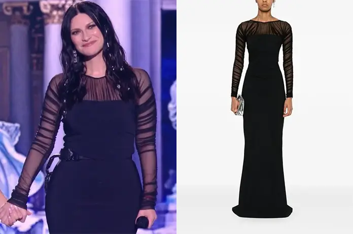 La diva italienne, qui connait bien le plateau du télé-crochet, portait une longue robe noire avec des empiècements semi-transparents froncés sur les manches longues et le haut du buste. Cette robe est signée Chiara Boni – La petite Robe, une créatrice que connait bien la chanteuse.