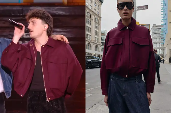 Léo a le plaisir de chanter avec Zaoui, sur le prime de la Star Academy, le 21 novembre. Il portait une veste bordeaux zippée, et à grandes poches que l’on trouve ici