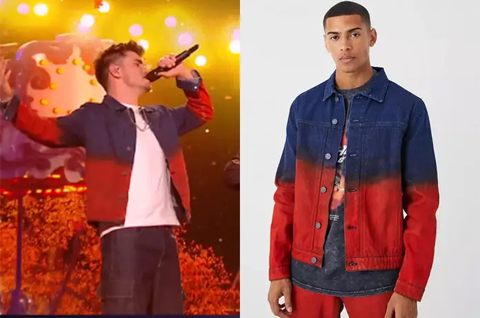 Il porte une veste en jean tie dye, bleu et rouge.
