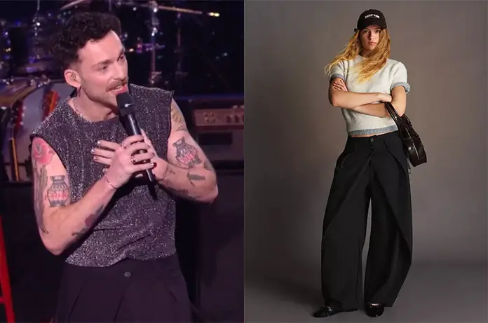Le jeune artiste portait un pantalon noir barrel à plis, que l’on trouve ici.