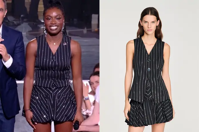Pour la demi-finale de la Star Academy, contre Léa, Sarah porte, ce 24 janvier sur TF1, un ensemble composé d’un gilet sans manches à rayures et d’une jupe taille haute à coupe évasée, également rayée. Le motif à fines rayures blanches sur fond noir évoque, certes, les codes du costume masculin, mais la silhouette est résolument féminine : la jupe s’évase avec fluidité, et la taille haute structure l’allure. Mais ce n’est pas tout.