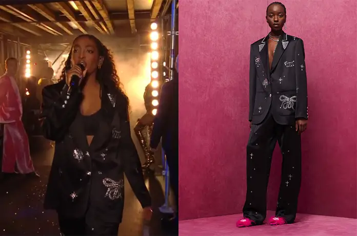 Ebony ouvre le prime de la Star Academy ce 18 janvier sur TF1. Elle porte un costume noir avec des motifs en strass.