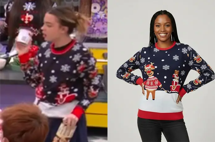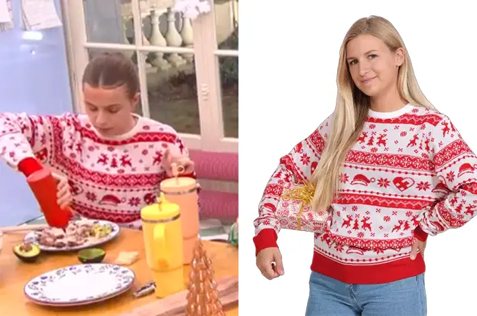Anouk a préféré un pull rouge et blanc avec des petits dessins de saison. Dispo ici