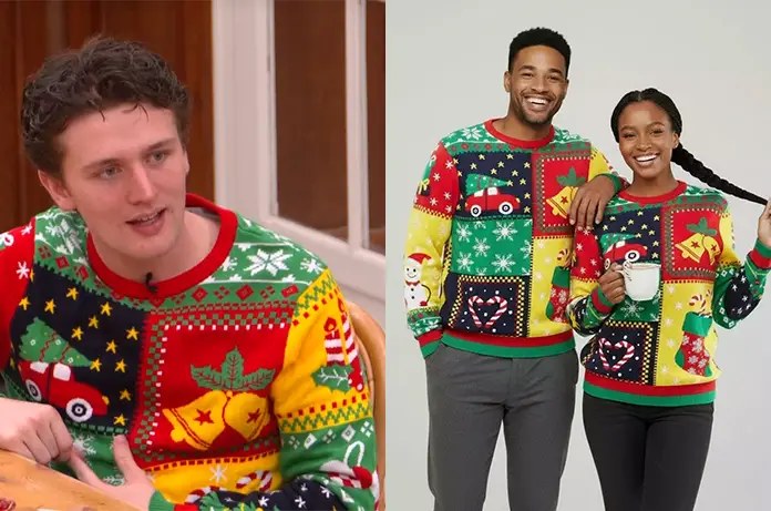 Victor a un pull vert avec un Père Noël qui dit « regarde-moi fouetter ».
