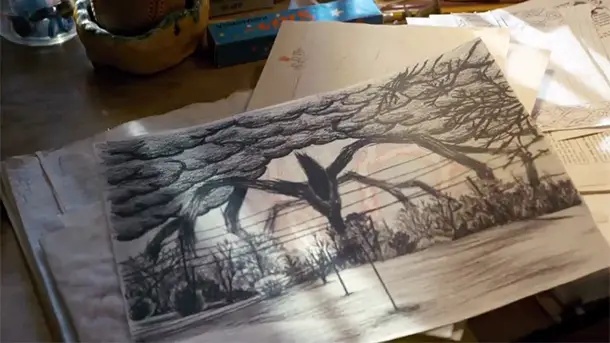 Quand Will (Noah Schnapp) a ses visions du monde à l’envers (upside-down), il les redessine dans la saison 2 de Stranger things (Netflix) … Il est possible de se procurer un dessin très similaire sur Etsy..