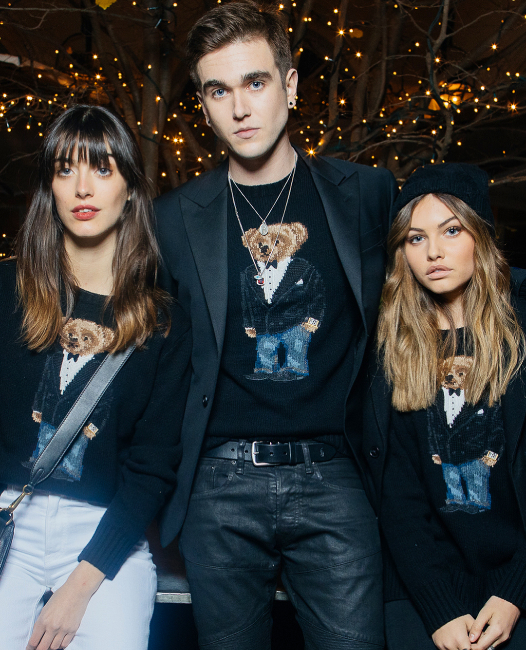 Gabriel Kane sublime le pull « polo bear » de Ralph Lauren. Sur un instagram récent, le jeune modèle musicien porte le teddy en smoking, sous un blazer. Il a rentré le pull dans jean slim stretch. Louise Follain et Thylane Blondeau portent le même pull pour lui tenir compagnie.