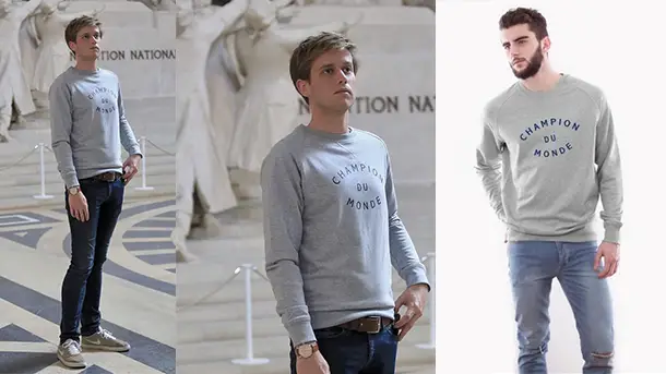 S’il n’était pas le journaliste intelligent que nous connaissons, on pourrait croire que Baptiste Mathon est un fashionisto lanceur de tendances, le roi de l’ #ootd (outfit of the day) sur Instagram… Une pose, un lieu (le Panthéon, vous savez le monument des Grands Hommes de France) et un sweat-shirt avec l’inscription tout empreinte d’humilité « Champion du Monde ».
