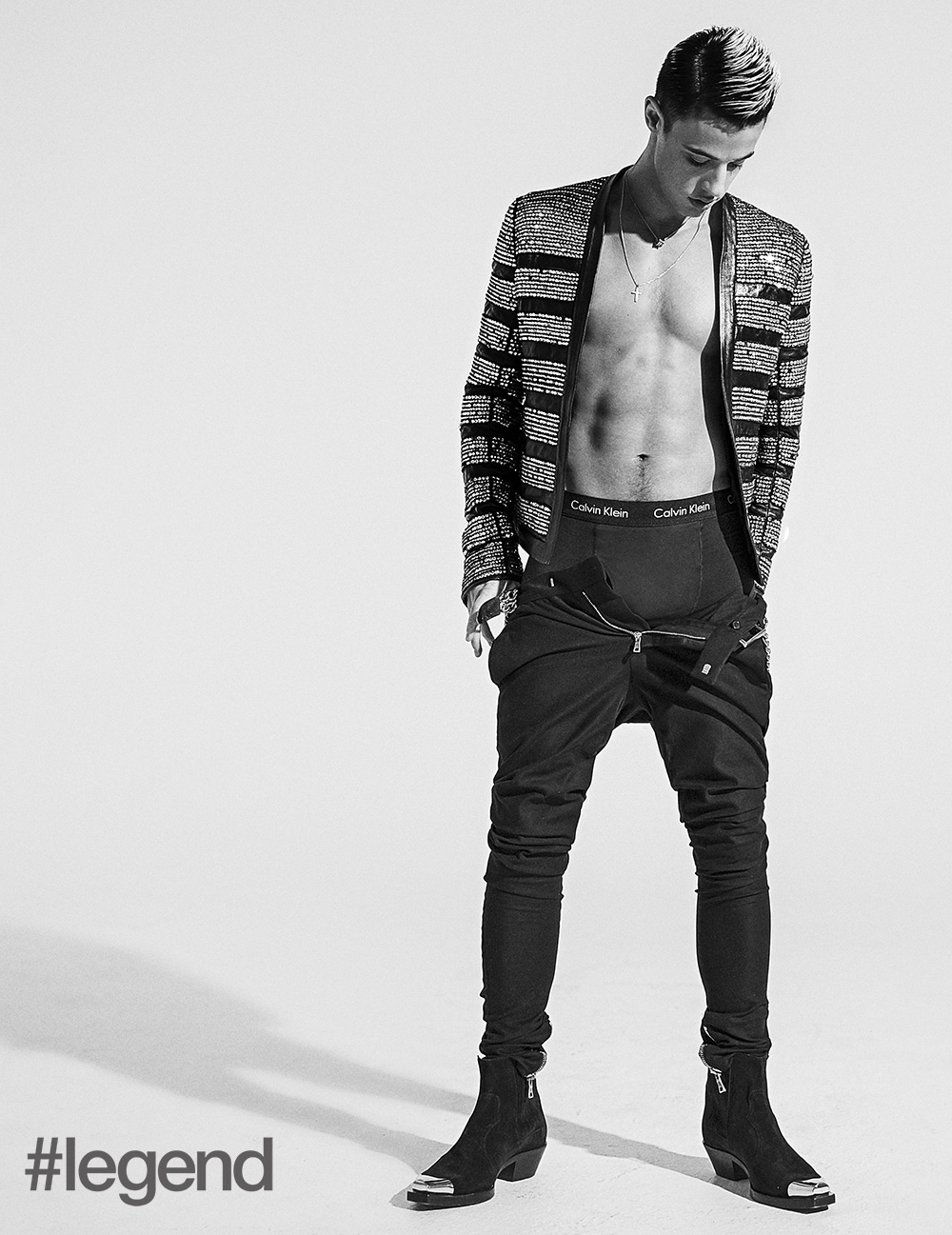 Cameron Dallas, un des plus célèbres millenials pose pour le #Legend de février. On le retrouve en Dolce & Gabbana (photo ci-dessus), marque qu’il connait bien puisqu’il a défilé pour elle à Milan. Il porte aussi du Balmain, du Calvin Klein, du Tom Ford ou du POLO Ralph Lauren.