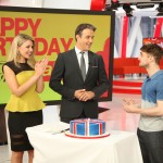 Hier, Daniel Radcliffe a été reçu par Ben Mulroney et Danielle McGimsie dans leur émission eTalk, à Toronto. A la fin du programme, il a reçu un gâteau d’anniversaire, puisqu’il fête aujourd’hui ses 25 ans. Il portait un polo Asos bleu délavé.