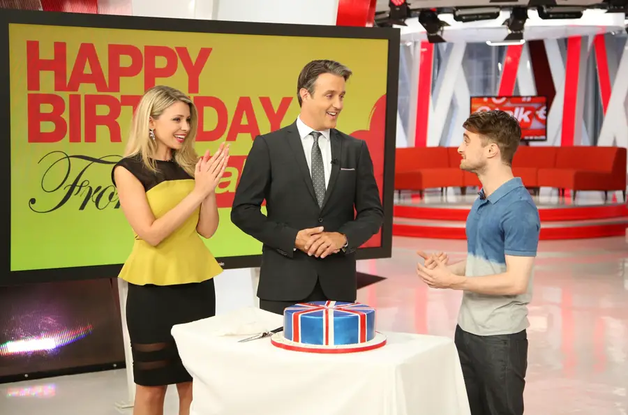 Hier, Daniel Radcliffe a été reçu par Ben Mulroney et Danielle McGimsie dans leur émission eTalk, à Toronto. A la fin du programme, il a reçu un gâteau d’anniversaire, puisqu’il fête aujourd’hui ses 25 ans. Il portait un polo Asos bleu délavé.