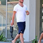 Il est loin le temps des tenues Chuck Bass qui l’ont rendu célèbre. Ed Westwick a été vu se balader à West Hollywood avec un ami, prendre une boisson chez Starbuck’s, ou faire quelques foulées. Sa tenue : t-shirt blanc, short bleu marine Canterbury et thongs.