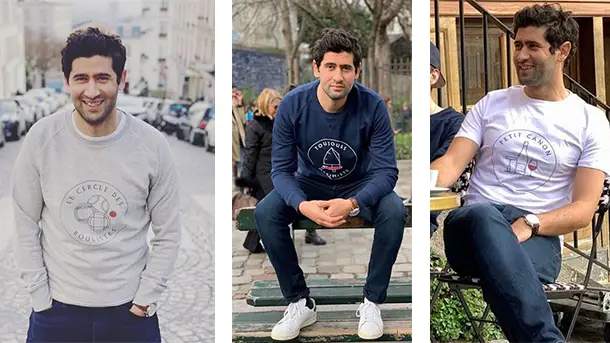 On connaissait Georges de Demain nous appartient et ses t-shirts geek, mais il y a aussi l’acteur, Mayel Elhajaoui qui est devenu une égérie de la marque Premier cercle. Une marque française de sweat-shirts et t-shirts avec des graphismes sympas qui représentent des habitudes très françaises (les boules, l’apéro), ou qui détournent certaines expressions. Ses vêtements sont fabriqués en coton bio et, elle le promet, d’une manière éthique pour le travailleur au Bangladesh.