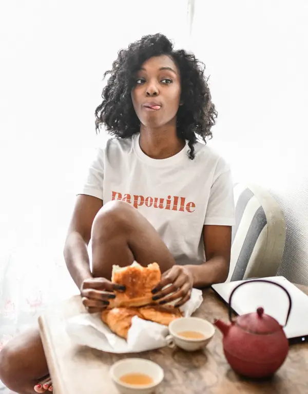 Aujourd’hui, dimanche, elle nous invite à se faire des papouilles dans un gentil moment cocooning. La belle actrice met ainsi en valeur un t-shirt de la marque Yayou que l’on peut retrouver ici.