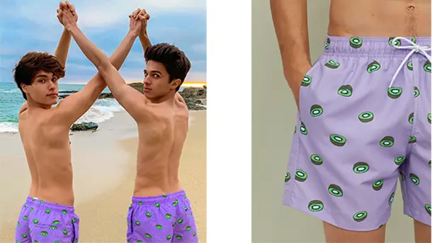 Les instagrammeurs Brent Rivera et Alex Stokes nous montrent différentes positions adoptées par leurs copines pour poser sur la plage. Ils portent un maillot de bain imprimé kiwis disponible ici.