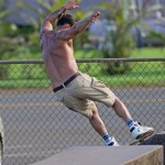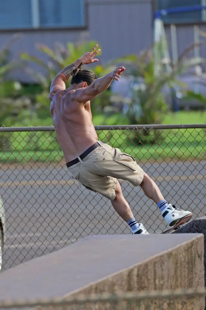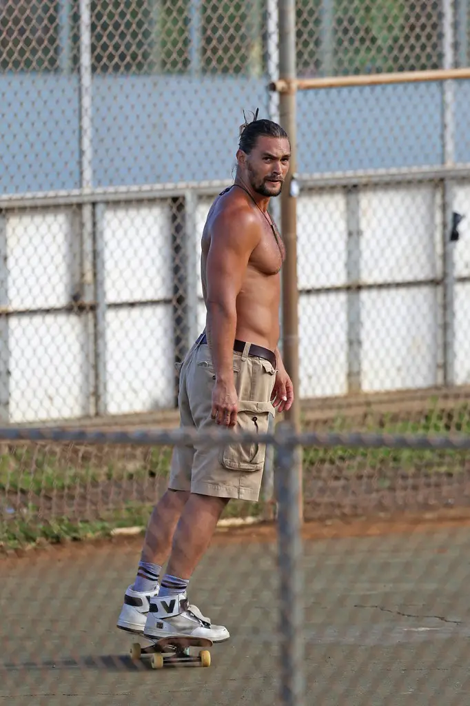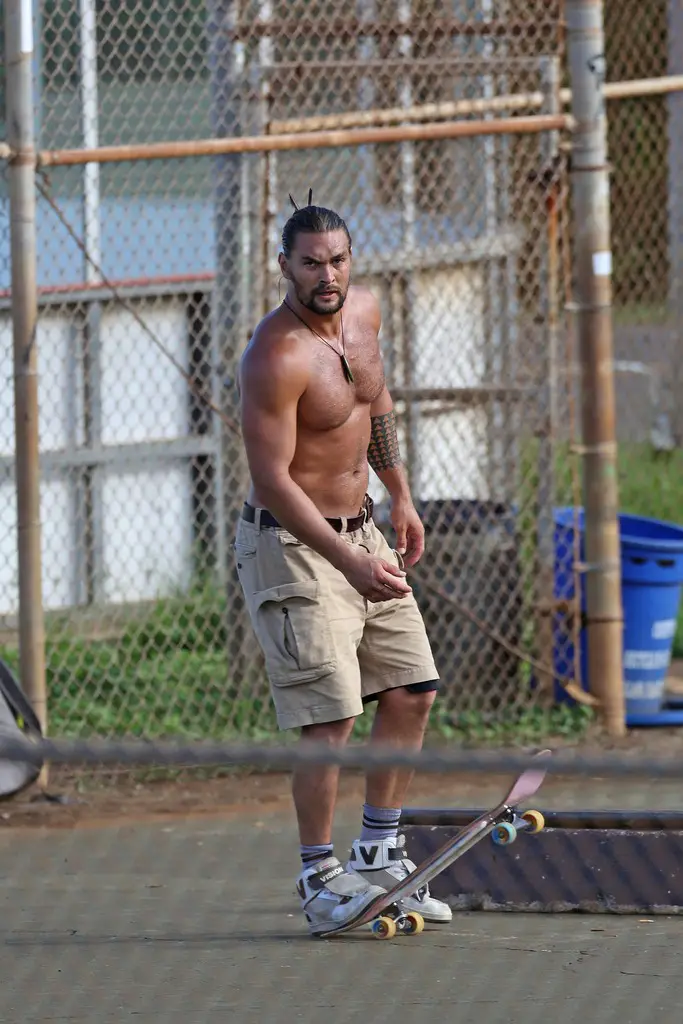 Jason Momoa, mondialement connu pour son interprétation de Khal Drogo dans Game of Thrones a été surpris, faisant du skate-board torse nu, il y a quelques jours à Hawaii. Il porte des baskets Vision Street Wear.