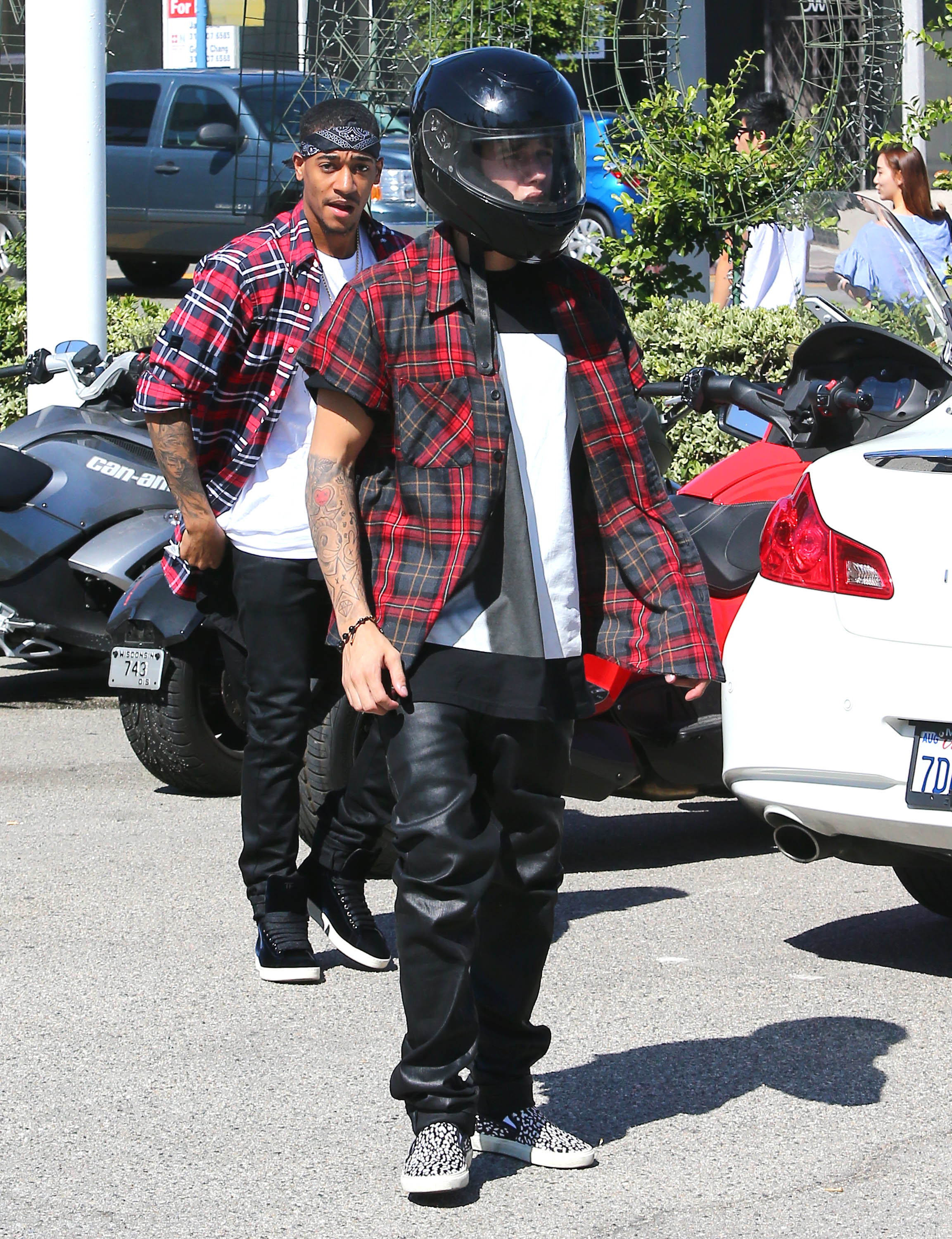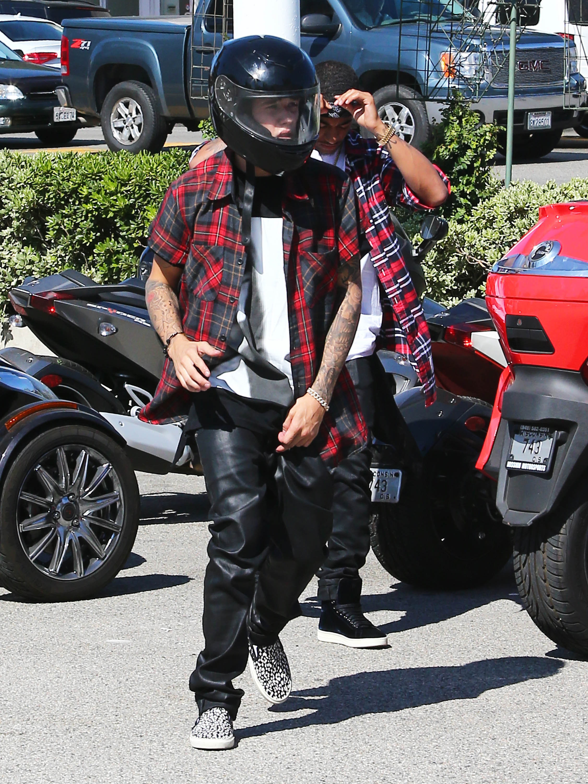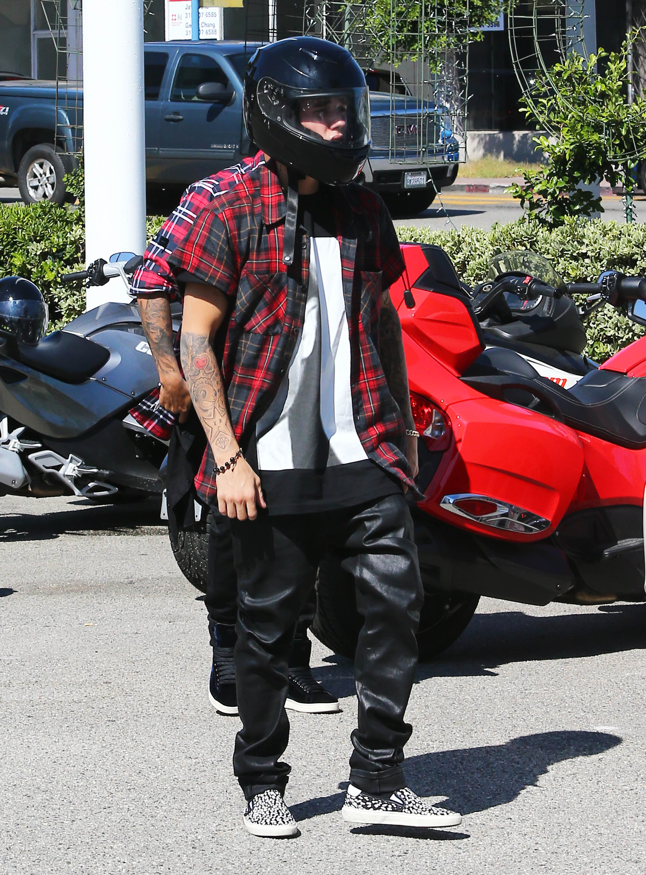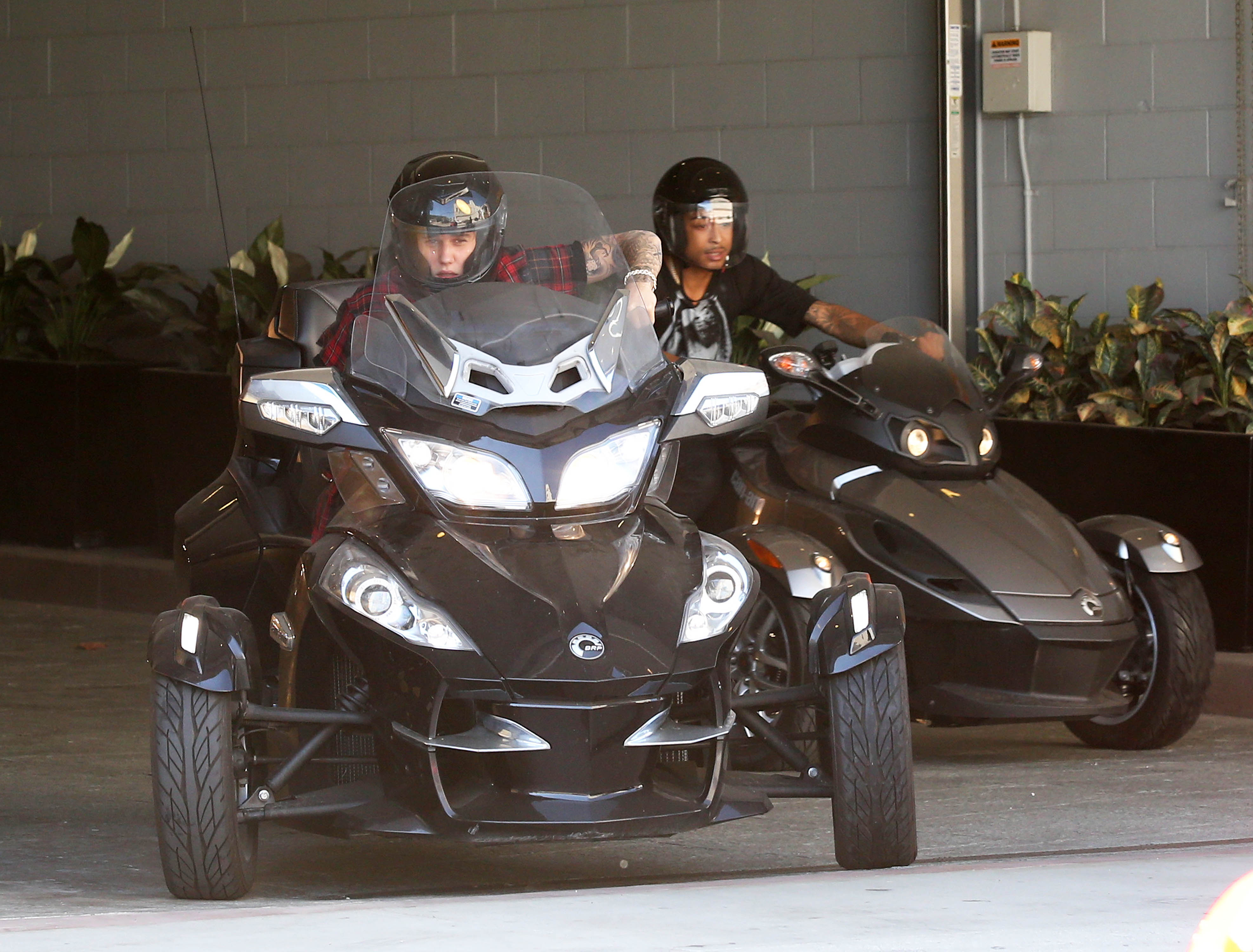 Justin Bieber s’est amusé ce 21 aout à piloter son Can-Am Spyder dans les rues (et sur les trottoirs) de Los Angeles… Il portait un t-shirt de la marque Hood By Air.