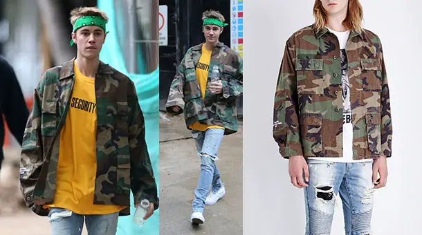 Toujours des photos de Justin Bieber habillé avec du merchandising du Purpose Tour. Ici, une chemise camouflage, que l’on peut trouver ici.
