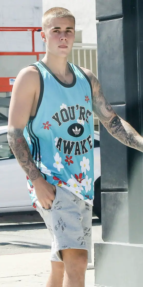 Look très fleuri pour Justin Bieber en balade à Los Angeles. Il porte un débardeur Adidas x Pharrell Williams