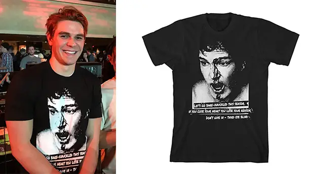 KJ Apa portait un t-shirt Third Eye Blind. Il est accompagné sur la photo de l’artiste Matt Olo-Whaanga.