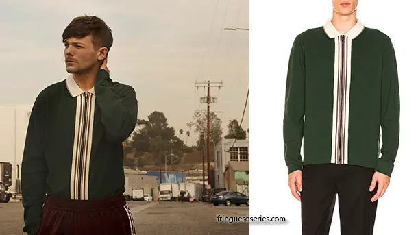 Pour la promo, Louis porte un polo à longues manches Stüssy et un jogging en velours Adidas.