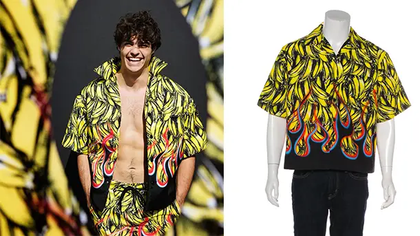 Noah Centineo apparait aujourd’hui sur son compte Instagram en total look Prada et son imprimé bananes. On trouve la chemise ici.