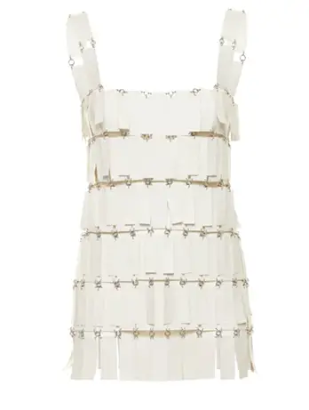 Parmi les images ancrées dans notre imaginaire, on retiendra celles de Françoise Hardy en tenues futuristes. La marque a voulu rendre un hommage à un des modèles portés par la chanteuse en le recréant pour la boutique de luxe florentine : Luisa Via Roma. Il s’agit d’une minirobe à bretelles faite de 6 rangées de petites plaquettes blanches.