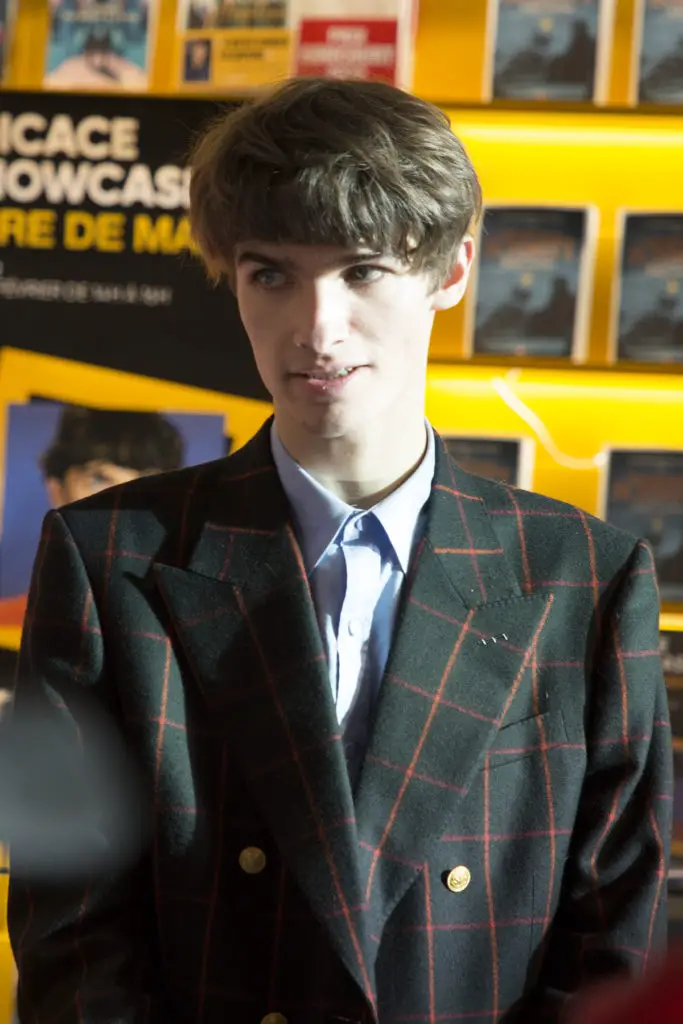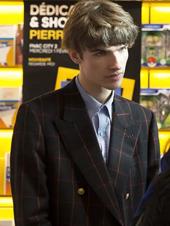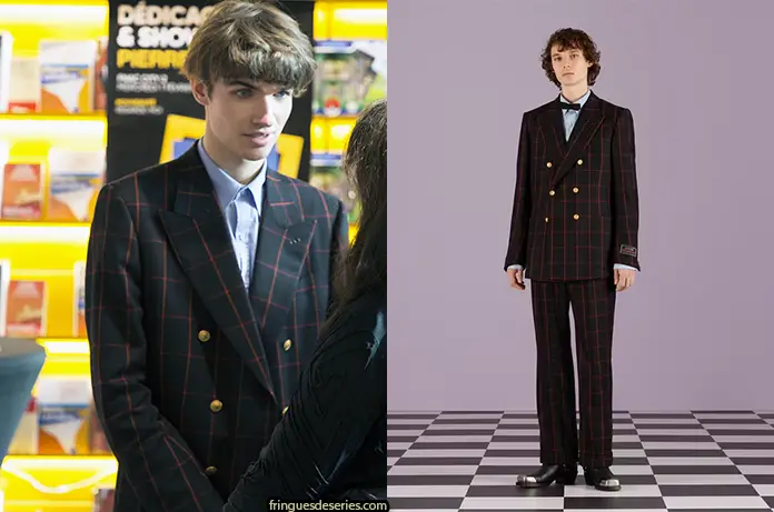 L’interprète de Enfant de portait un costume en laine à carreaux noir et rouge. Le blazer est à double boutonnage. Je suis moins fan de l’étiquette Gucci bien visible sur le poignet gauche.