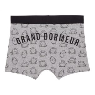 Boxer gris chiné en coton mélangé avec print de Ronflex des Pokémons et message GRAND DORMEUR dans le dos. 12,95€