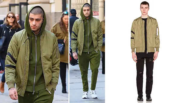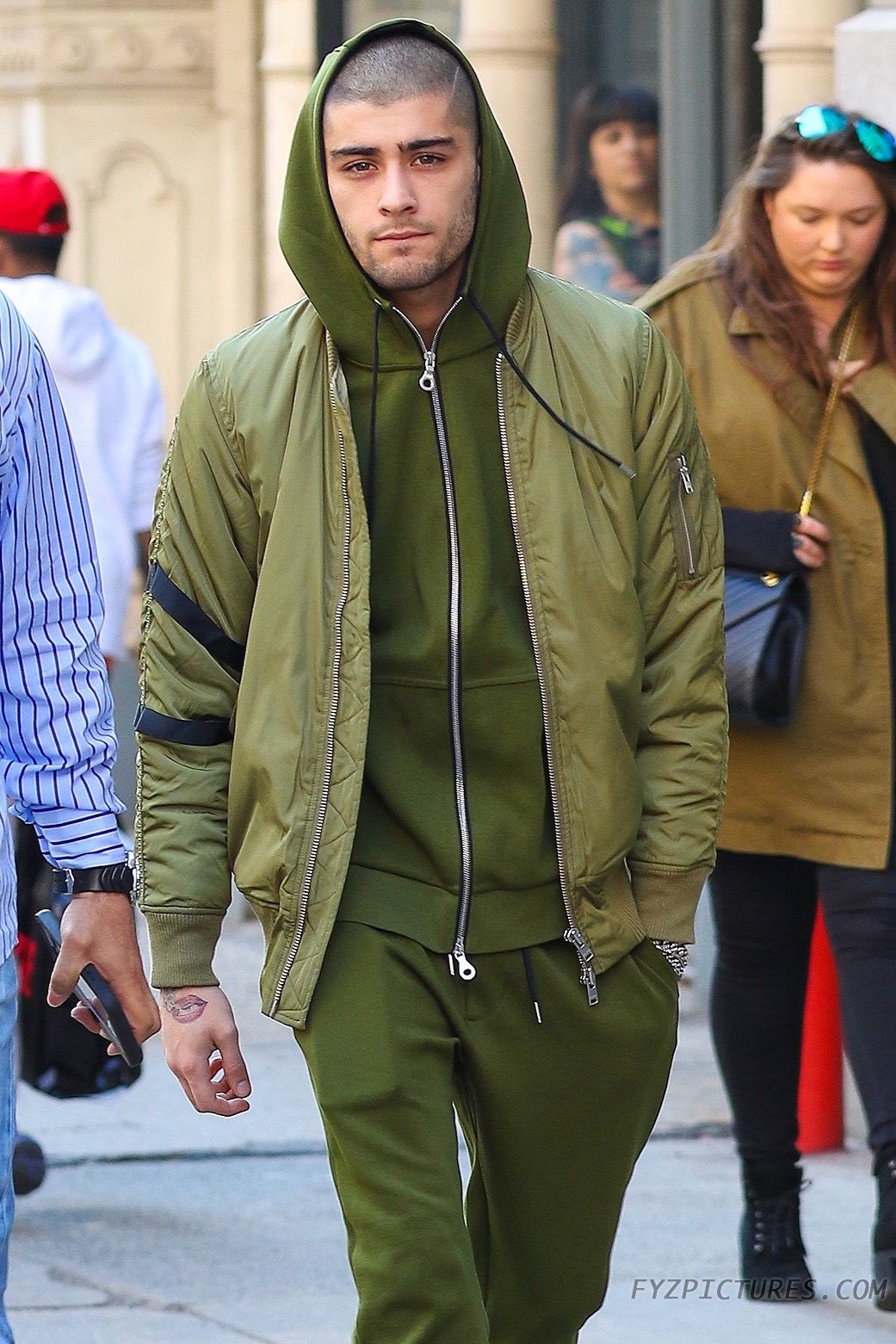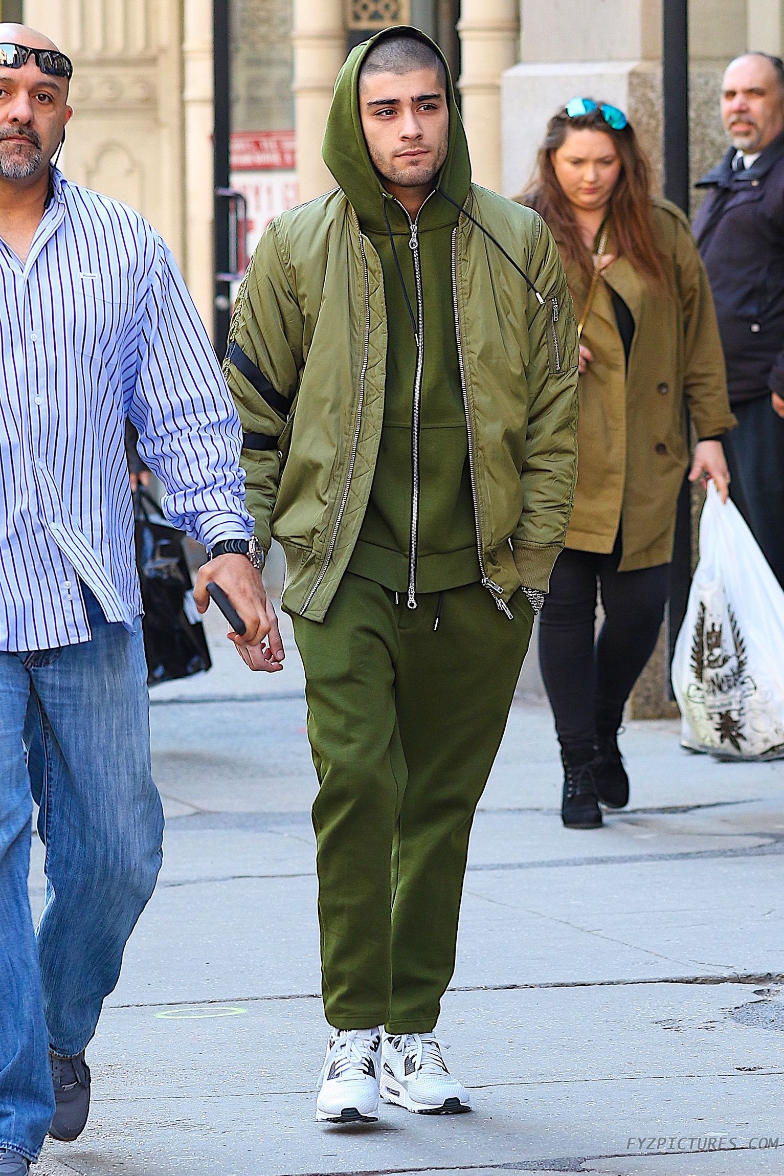 Zayn dans les rues de New York avec un bomber olive STAMPD.