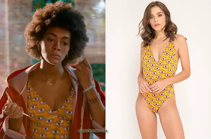 Premières images de Summer (Rebecca Coco Edogamhe) dans Summertime 1×01 qui porte ce maillot de bain jaune avec des yeux partout.