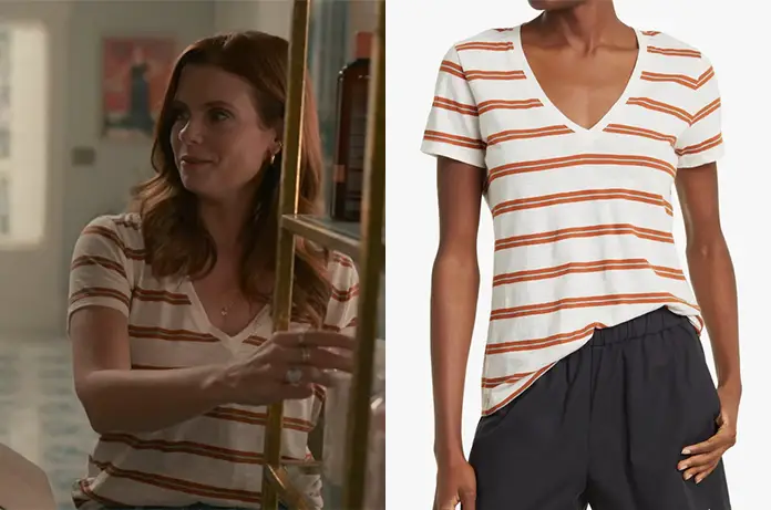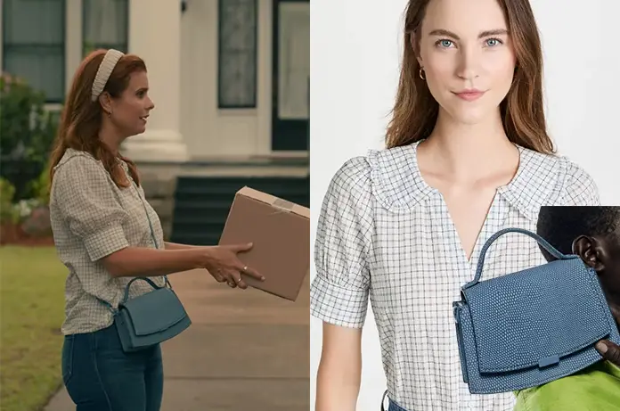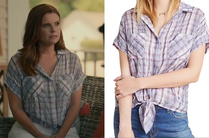 Dans le premier épisode de la saison 3 de A l’ombre des magnolias, Maddie (JoAnna Garcia Swisher) reçoit un colis de la défunte Frances. Elle porte une blouse à carreaux avec col Peter Pan, encore disponible, ici, sur eBay.
