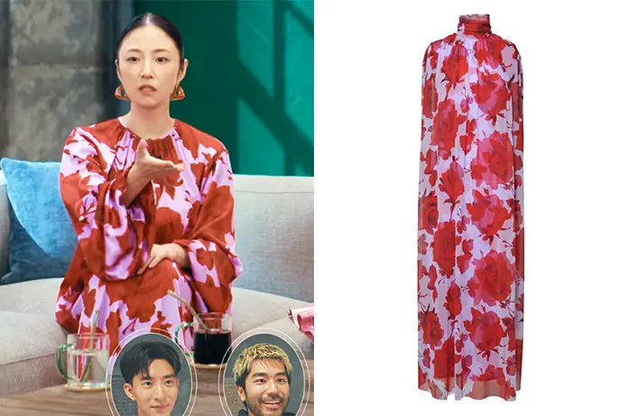 Dans la nouvelle saison de The Boyfriend sur Netflix, on retrouve Megumi pour commenter les aventures des garçons. Elle porte dans le premier épisode de cette saison 2 une longue robe violette à motif floral. On la retrouve ici