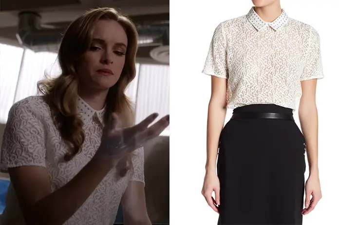 Caitlin Snow (Danielle Panabaker) porte, à la fin de The Flash 3×02, cette blouse à manches courtes, à dentelles. Il s’agit d’un modèle en rupture de stock de The Kooples