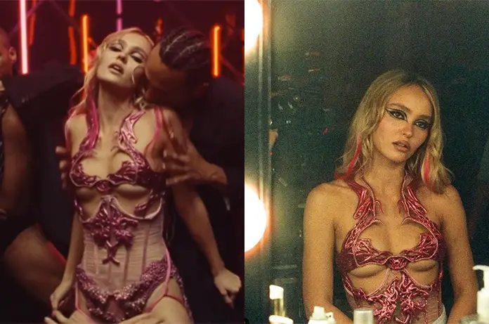 Dans l’épisode 2 de The Idol, Jocelyn (Lily-Rose Depp) danse pour son clip dans ce body métallique rose, un vêtement volontairement inconfortable.