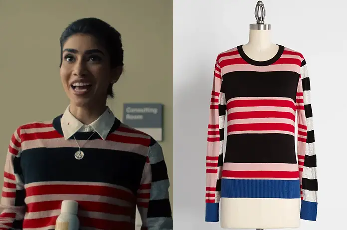Abbi Singh (Rhianna Jagpal) porte un pull à rayures de diverses couleurs dans The Imperfects 1×01, sur Netflix.