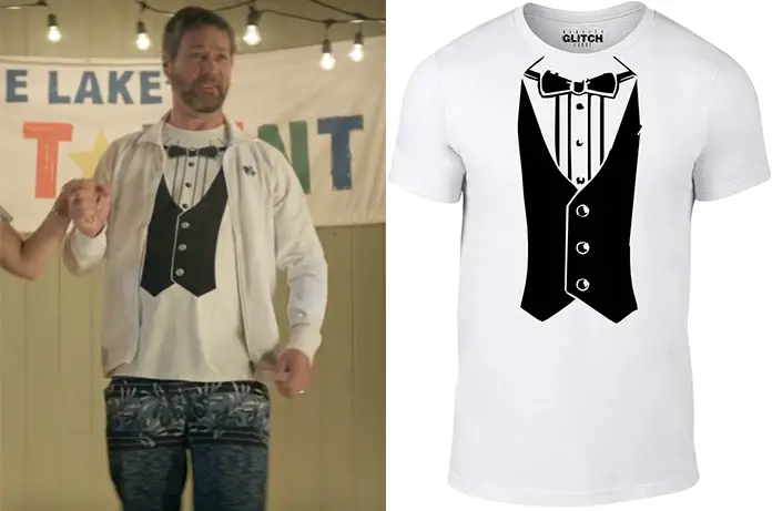 Il portait au-dessus un t-shirt rigolo, avec un imprimé gilet de smocking et nœud pap que l’on trouve ici