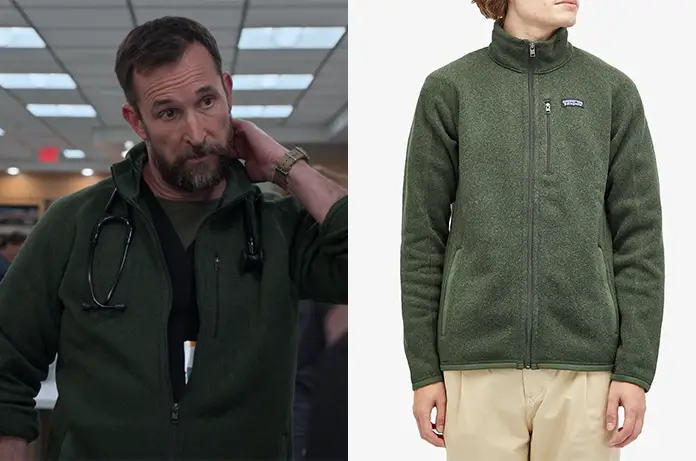 Le docteur Michael Robinavitch (Noah Wyle) ne garde pas sa veste dans tout l’épisode 2×01 de The Pitt. Il l’enlève pour montrer une seconde veste zippée en polaire d’un vert sapin. Il s’agit d’un modèle de la marque Patagonia. Ces sweats zippés sont dispos ici ou ici (Belgique) en plein de coloris. Pour vos recherches, le vert de Robbie s’appelle « torrey pine »