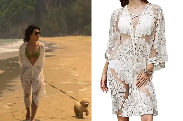 Dans Le Serpent (The Serpent) (1×02), diffusé sur Netflix, , Marie-Andrée (Jenna Coleman) va devenir Monique en portant ce kimono de plage blanc, en dentelles. On le trouve ici.