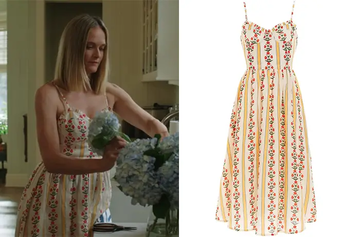 Susannah (Rachel Blanchard) accueille ses invités dans The Summer I turned pretty 1x01avec cette délicate robe fleurie à bretelles. Cette robe de la marque Agua Bendita (modèle Carmina) se trouve encore sur eBay ou d’autres sites de seconde main. Ici, par exemple.