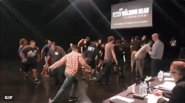 A croire ce gif, voilà comment se passe une audition pour engager les figurants zombies, les fameux walkers de la série AMC the walking dead. On ne sait pas si le candidat en short noir, très motivé, à gauche, a été retenu.