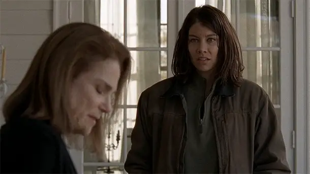 Maggie (Lauren Cohen) est en grande discussion avec Deanna, la cheffe d’Alexandria dans The Walking dead. Dans ce 16e épisode de la saison 5 (visib